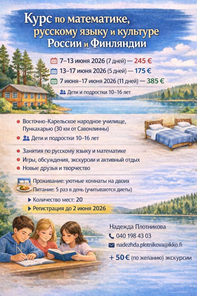 Leirillä vahvistetaan hauskalla ja toiminnallisella tavalla venäjän kielen, matematiikan ja kulttuurin osaamista sekä tutustutaan samalla suomalaiseen kieleen ja kulttuuriin. Yhdessä oppiminen tarjoaa luontevan mahdol-lisuuden saada uusia ystäviä ja tutustua eri kieli- ja kulttuuritaustoihin.