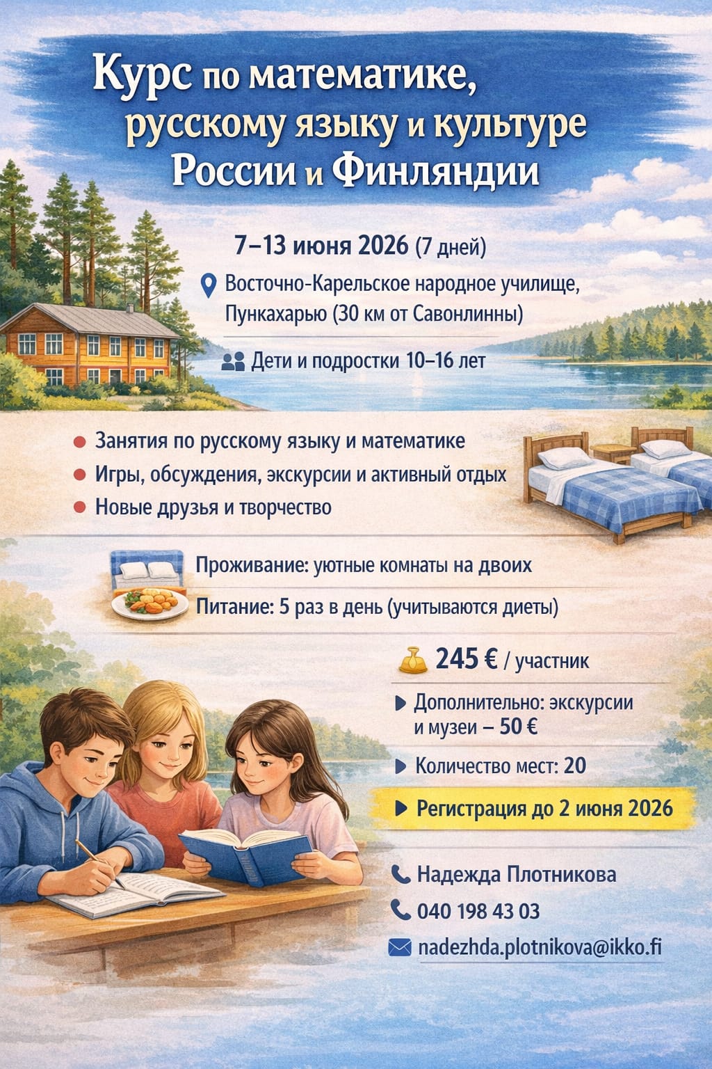 Leirillä vahvistetaan hauskalla ja toiminnallisella tavalla venäjän kielen, matematiikan ja kulttuurin osaamista sekä tutustutaan samalla suomalaiseen kieleen ja kulttuuriin. Yhdessä oppiminen tarjoaa luontevan mahdol-lisuuden saada uusia ystäviä ja tutustua eri kieli- ja kulttuuritaustoihin.