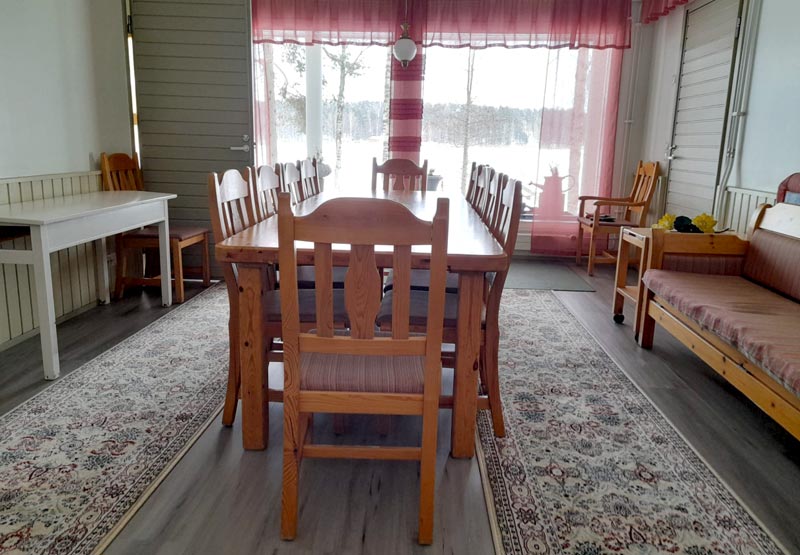 Tilava ja viihtyisä takkahuone tarjoaa oleskelutilaa noin 20 hengelle ja pöydän ääreen mahtuu mukavasti 12 henkilöä ruokailemaan tai kokoustamaan. Halutessasi voitte tilata saunalle valmiit tarjottavat opiston catering-palvelusta tai tuoda omat tarjoilut. Opistolla ei ole anniskeluoikeuksia, joten alkoholilliset saunajuomat voitte tuoda itse.